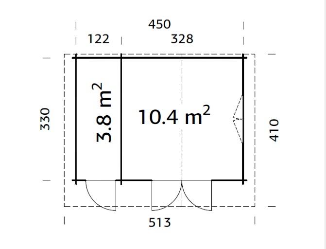 Dimensions extérieures paroi (largeur x profondeur) : 450 x 330 cm= 14,8 m²