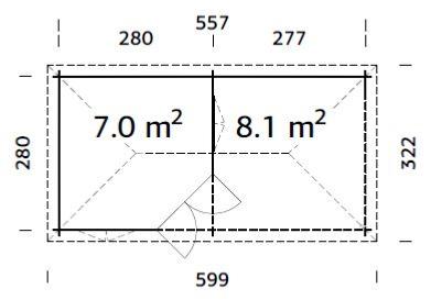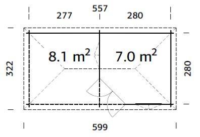 Dimensions extérieures paroi (largeur x profondeur) : 557 x 280 cm = 7,5 m²