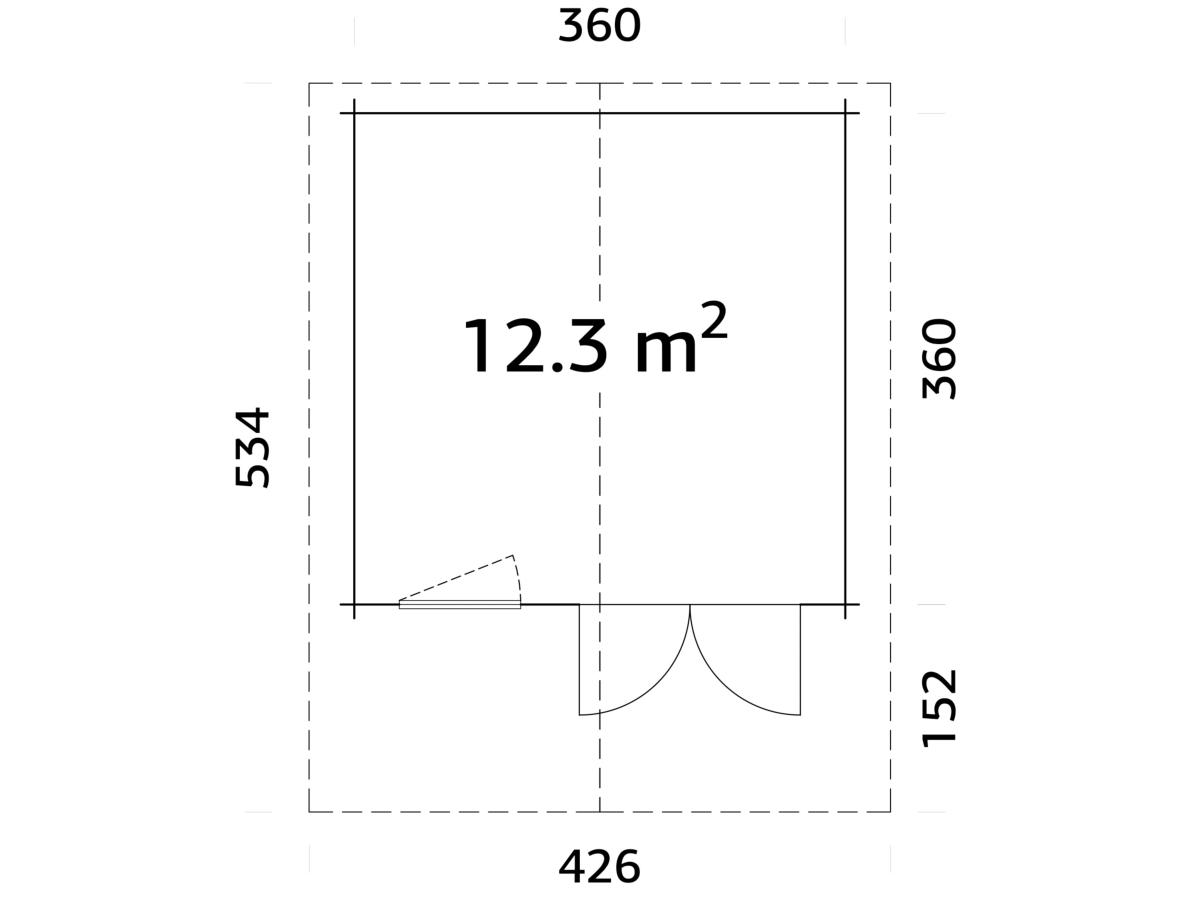 Dimensions intérieures au sol (largeur x profondeur) : 351 x 351 cm = 12,3 m²