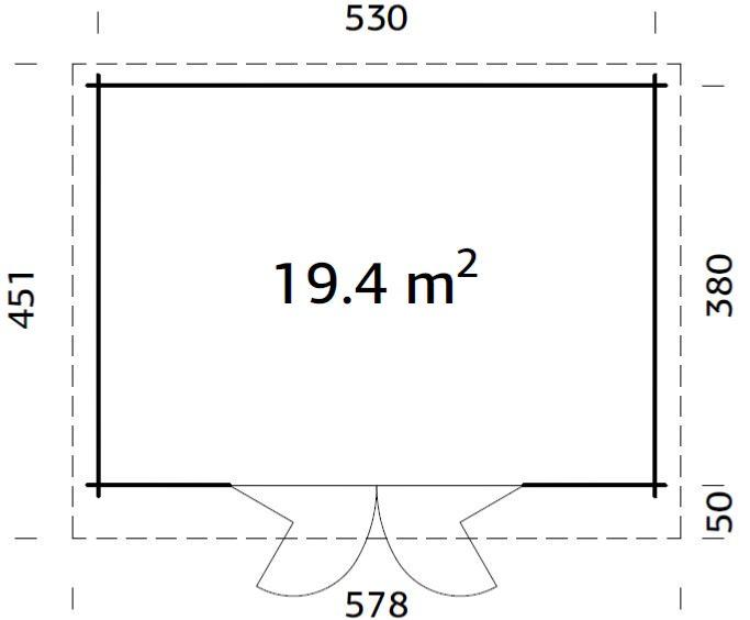 Dimensions extérieures paroi (largeur x profondeur) : 530 x 380 cm=  20,1 m²