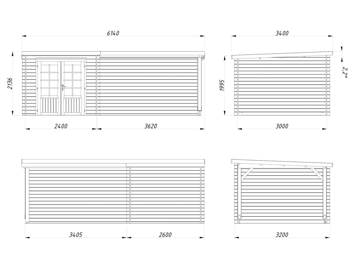 Dimensions abri 6,9 m²+ auvent de 10 m² bardé sur la paroi du fond épaisseur 28 mm: