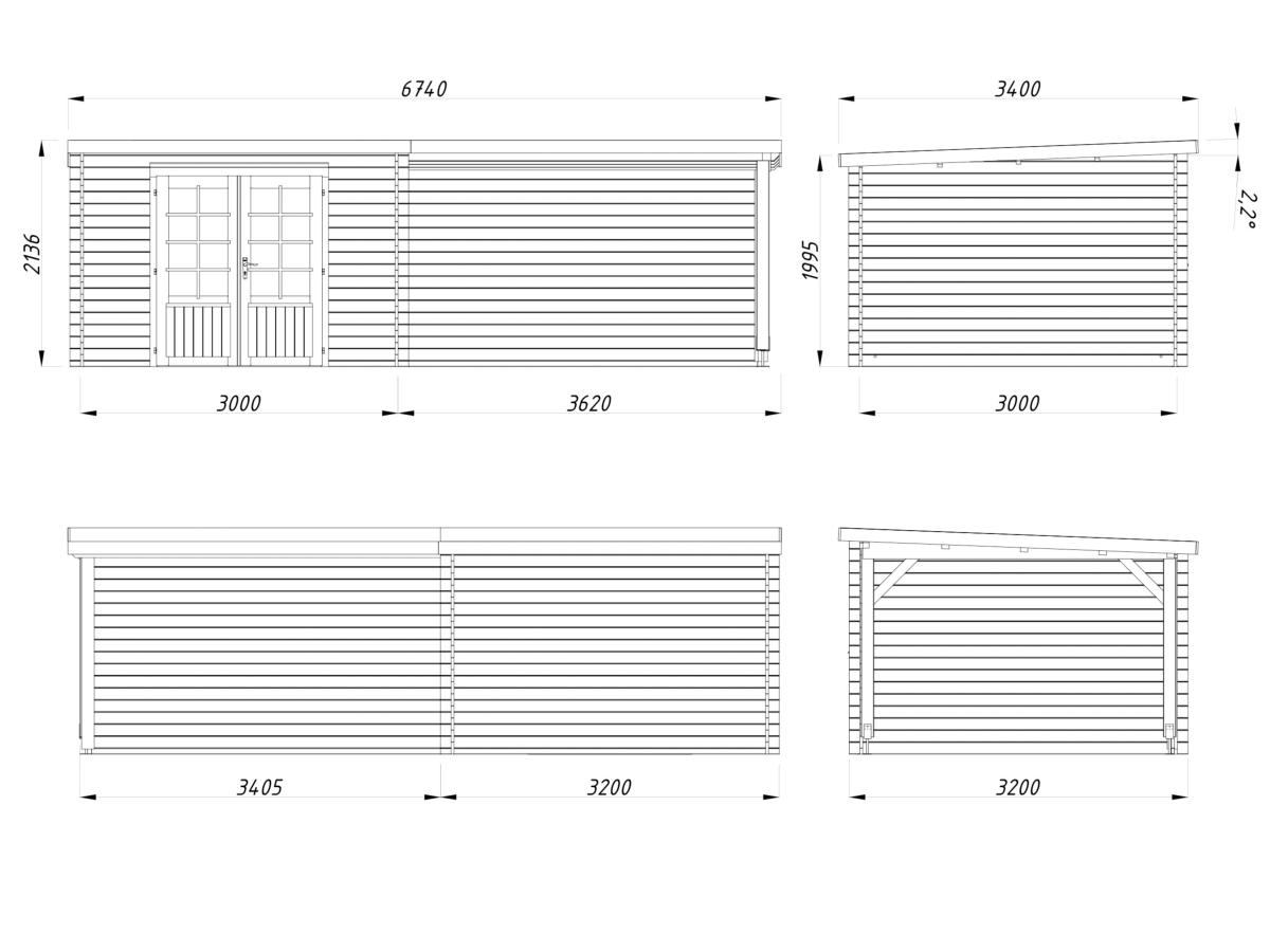 Dimensions abri 8,7 m² + auvent de 10 m² bardé sur la paroi du fond épaisseur 28 mm: