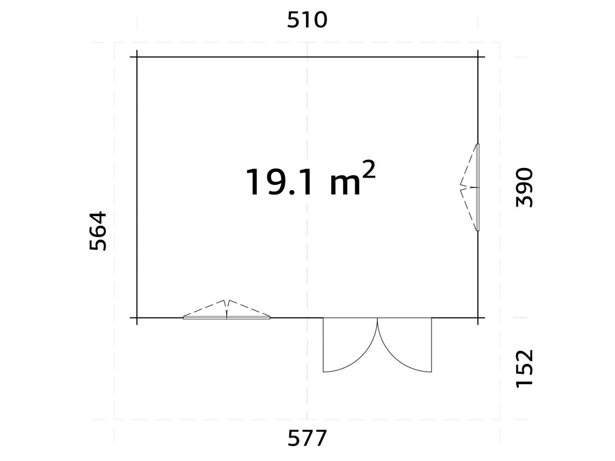 Dimensions intérieures au sol (largeur x profondeur) : 501 x 381 cm = 19,1 m²