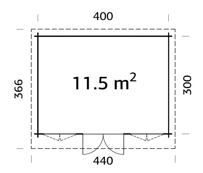 Dimensions intérieures au sol (largeur x profondeur) : 441 x 321 cm = 11,5 m²
