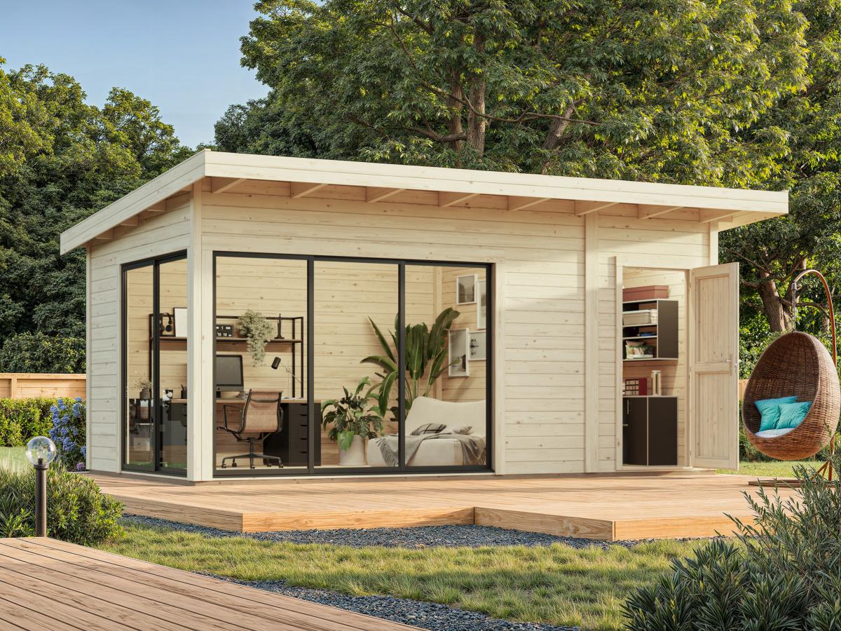 Le studio de jardin Palmako Andrea 15,2 m² Slide offre un espace lumineux et moderne, idéal comme bureau de jardin, pièce de détente ou espace polyvalent. Sa structure en bois massif 44 mm et sa porte coulissante vitrée en aluminium assurent confort, durabilité et esthétique contemporaine.