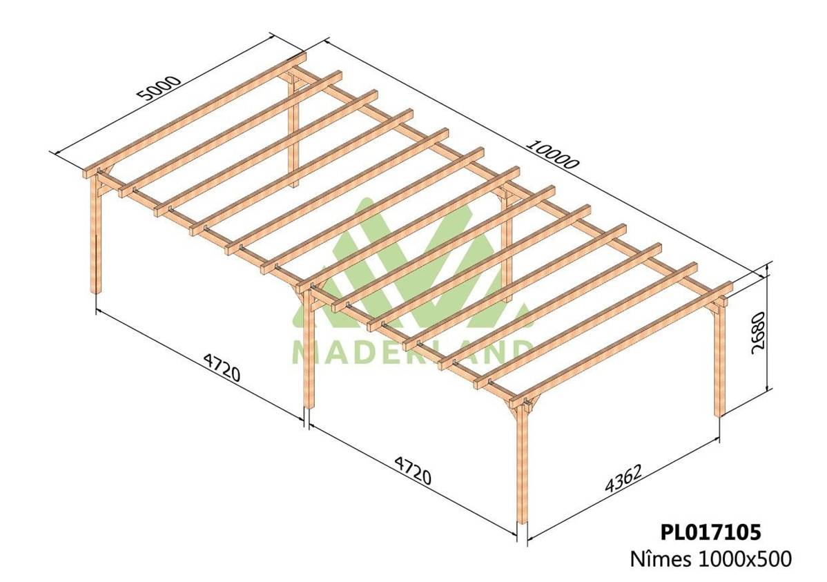 La quantité de poteaux, de poutres et de traverses peut varier en fonction des dimensions choisies, cette carport a 6 poteaux, 4 poutres et 13 traverses.