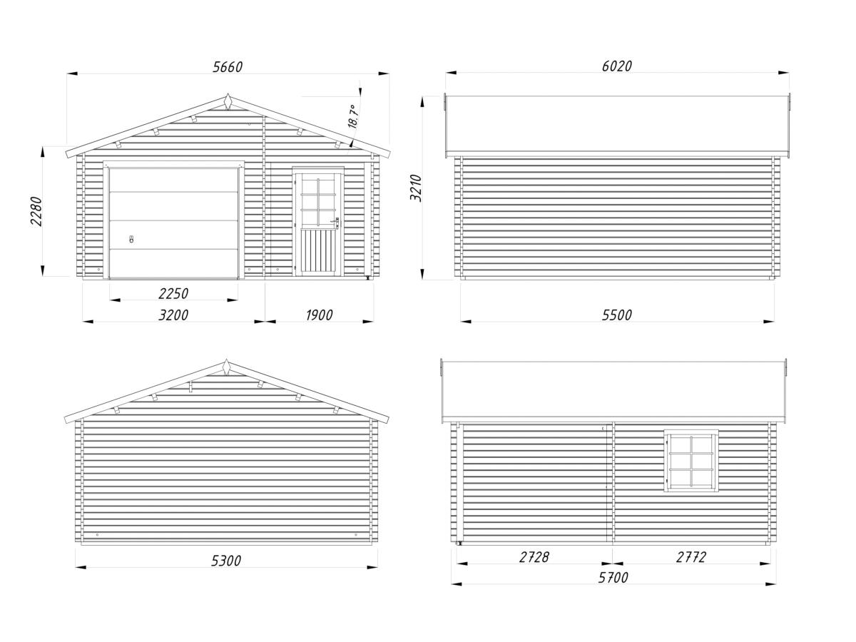 Garage bois de 23.9 m² surface intérieure  + un auvent de 5.2 m² en épaisseur madriers 44 mm équipé d'une porte sectionnelle moderne  une porte de service et une fenêtre