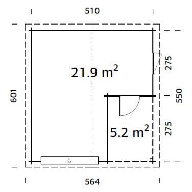 Dimensions intérieures au sol (largeur x profondeur) : 501 x 541 cm - terrasse (189 x 275cm) = 21,9 m²
