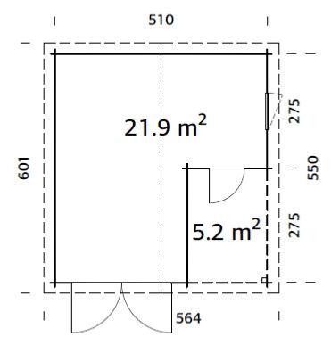 Dimensions intérieures au sol (largeur x profondeur) : 501 x 541 cm - terrasse (189 x 275cm) = 21,9 m²