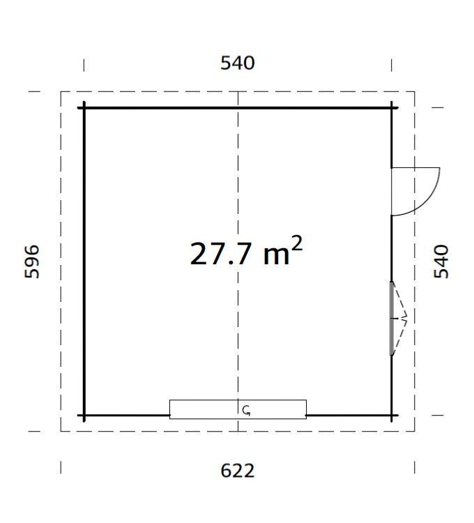 Dimensions extérieures paroi (largeur x profondeur) : 540 x 540 cm= 29,3 m²