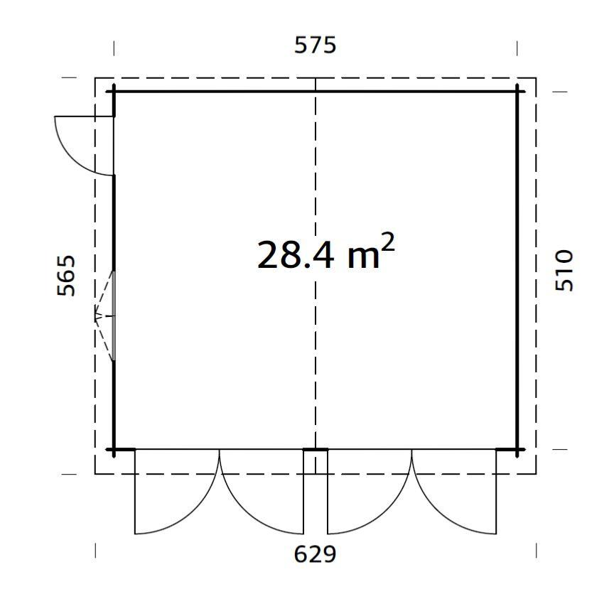 Dimensions intérieures au sol (largeur x profondeur) : 566 x 501 cm = 28,4 m²