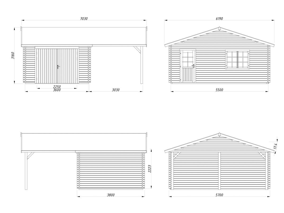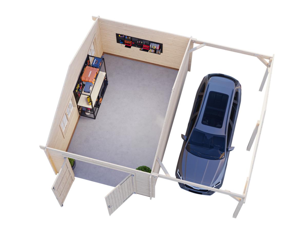 Le Roger 19,0+16,2 m² avec double porte en bois de la marque Palmako est un garage en bois conçu pour un usage garage, atelier et stockage. Sa conception en madriers massifs garantit une excellente stabilité et une longévité adaptée à un usage extérieur toute l’année.