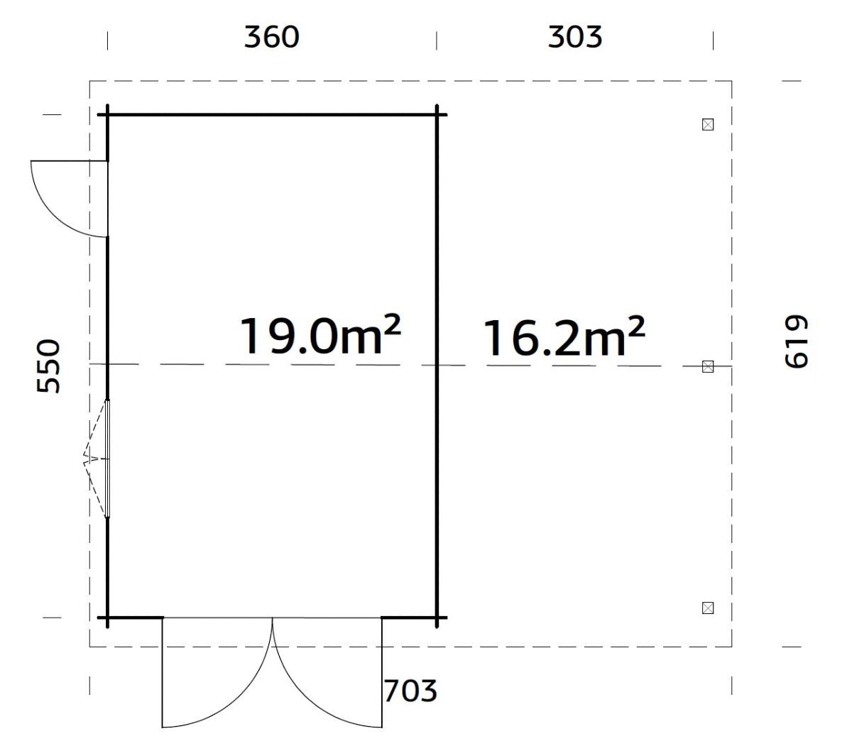 - Surface au sol : 653 × 550 cm (surface utile 19,0 m²)