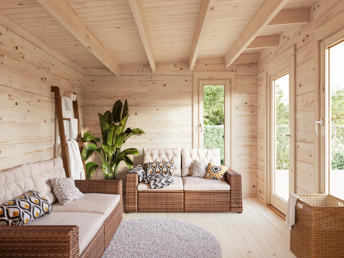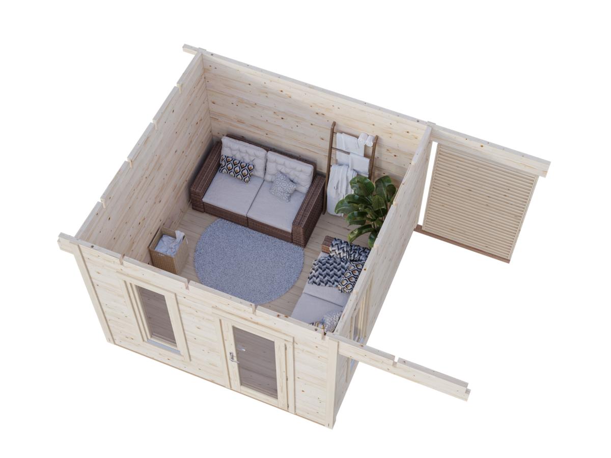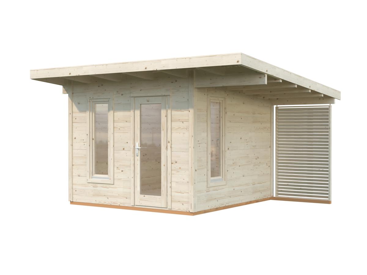 Conçu en épicéa nordique massif certifié FSC, ce studio offre une excellente stabilité et une grande durabilité. L’annexe de 4,1 m² permet de créer un espace de rangement ou une zone fonctionnelle supplémentaire, protégée sous l’avancée du toit.