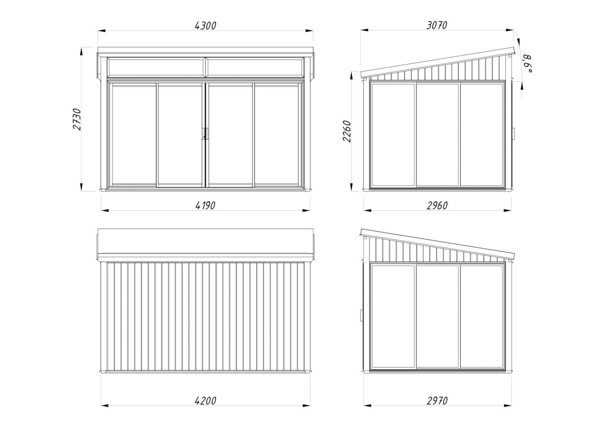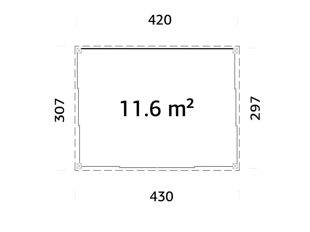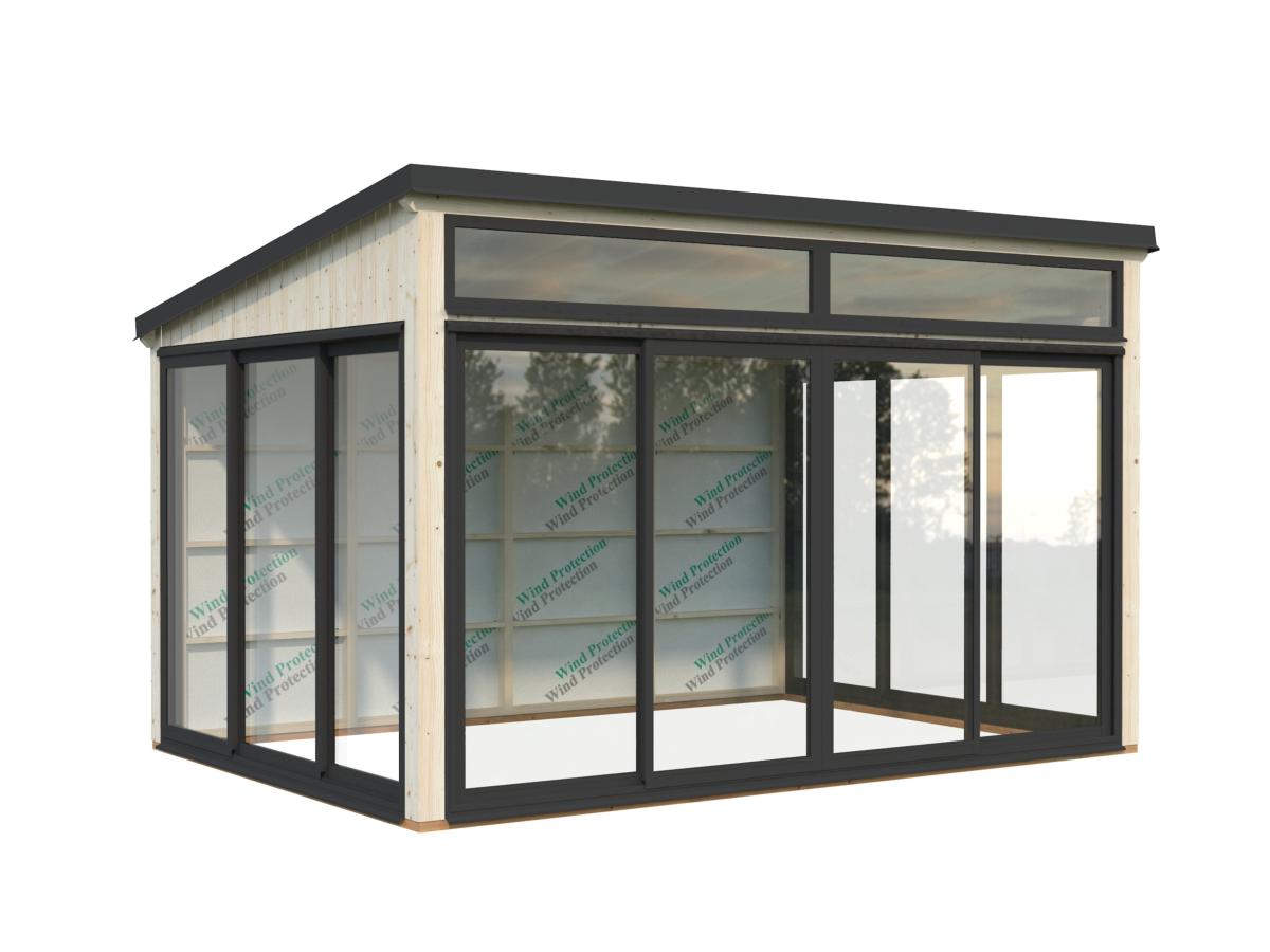 Sa structure en épicéa nordique certifié FSC assure robustesse et durabilité. Son design contemporain à toiture plate s’intègre parfaitement aux aménagements extérieurs modernes.