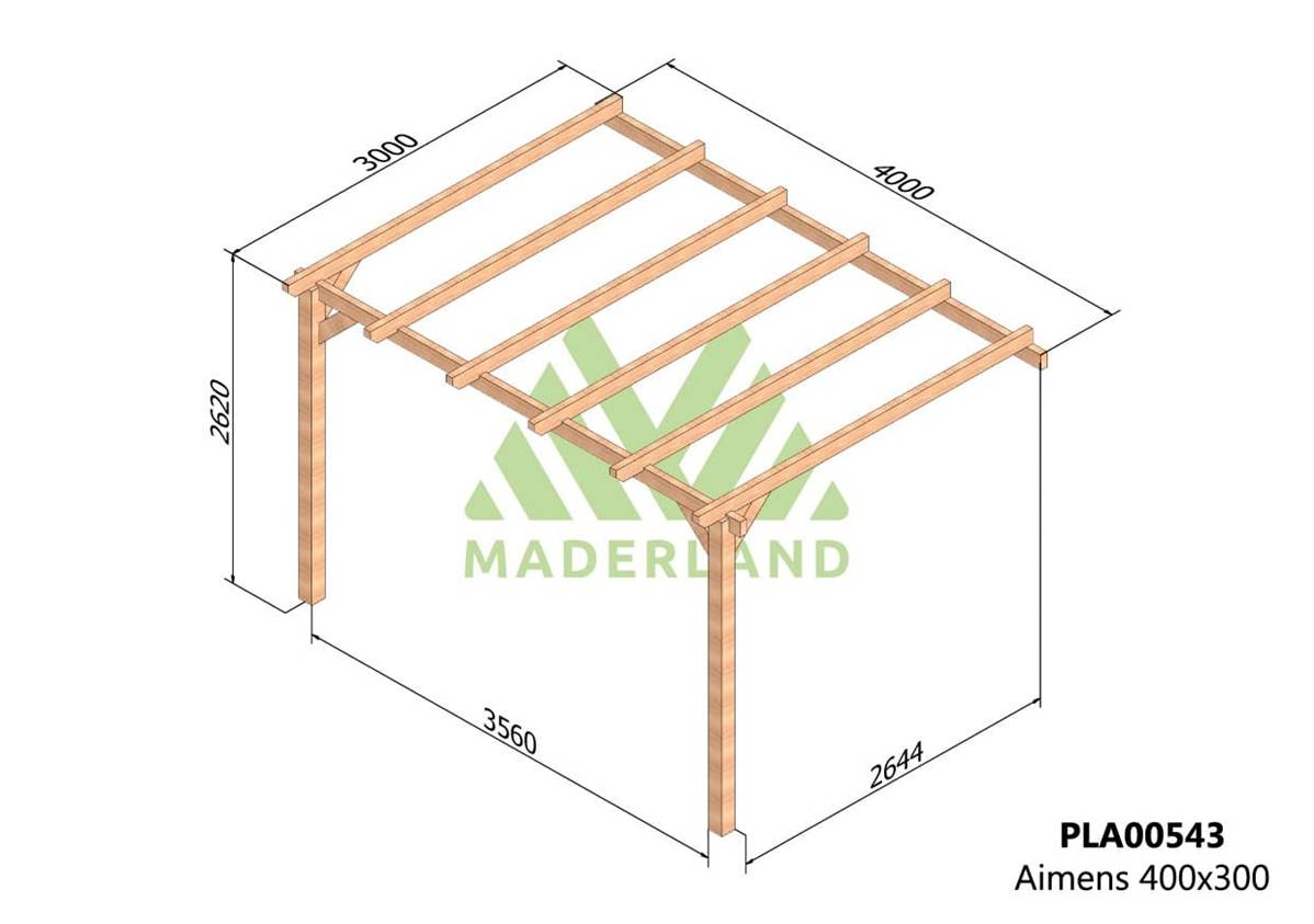 La quantité de poteaux, de poutres et de traverses peut varier en fonction des dimensions choisies, cette pergola a 2 poteaux, 2 poutres et 6 traverses.