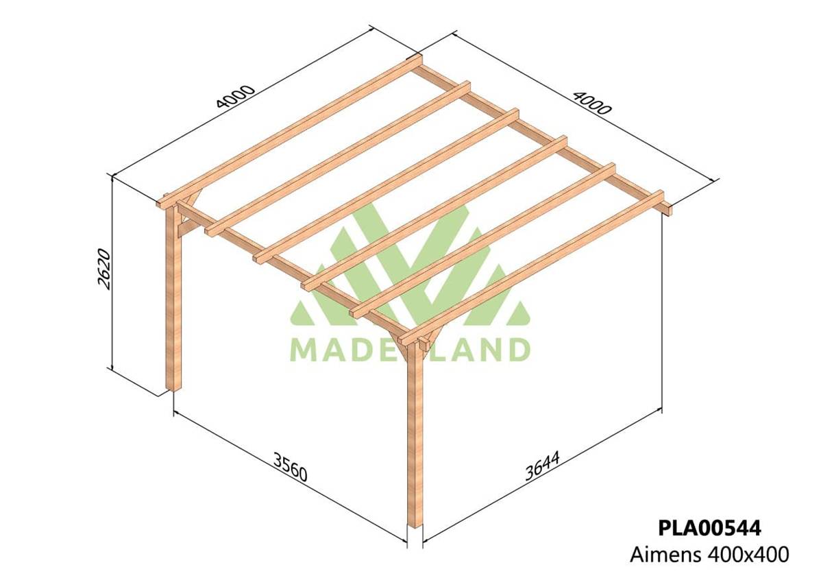 La quantité de poteaux, de poutres et de traverses peut varier en fonction des dimensions choisies, cette pergola a 2 poteaux, 2 poutres et 6 traverses.