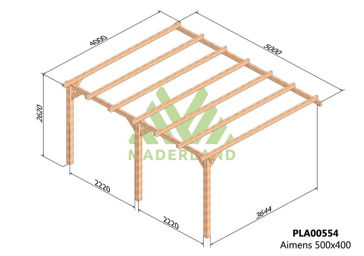 La quantité de poteaux, de poutres et de traverses peut varier en fonction des dimensions choisies, cette pergola a 3 poteaux, 4 poutres et 7 traverses.