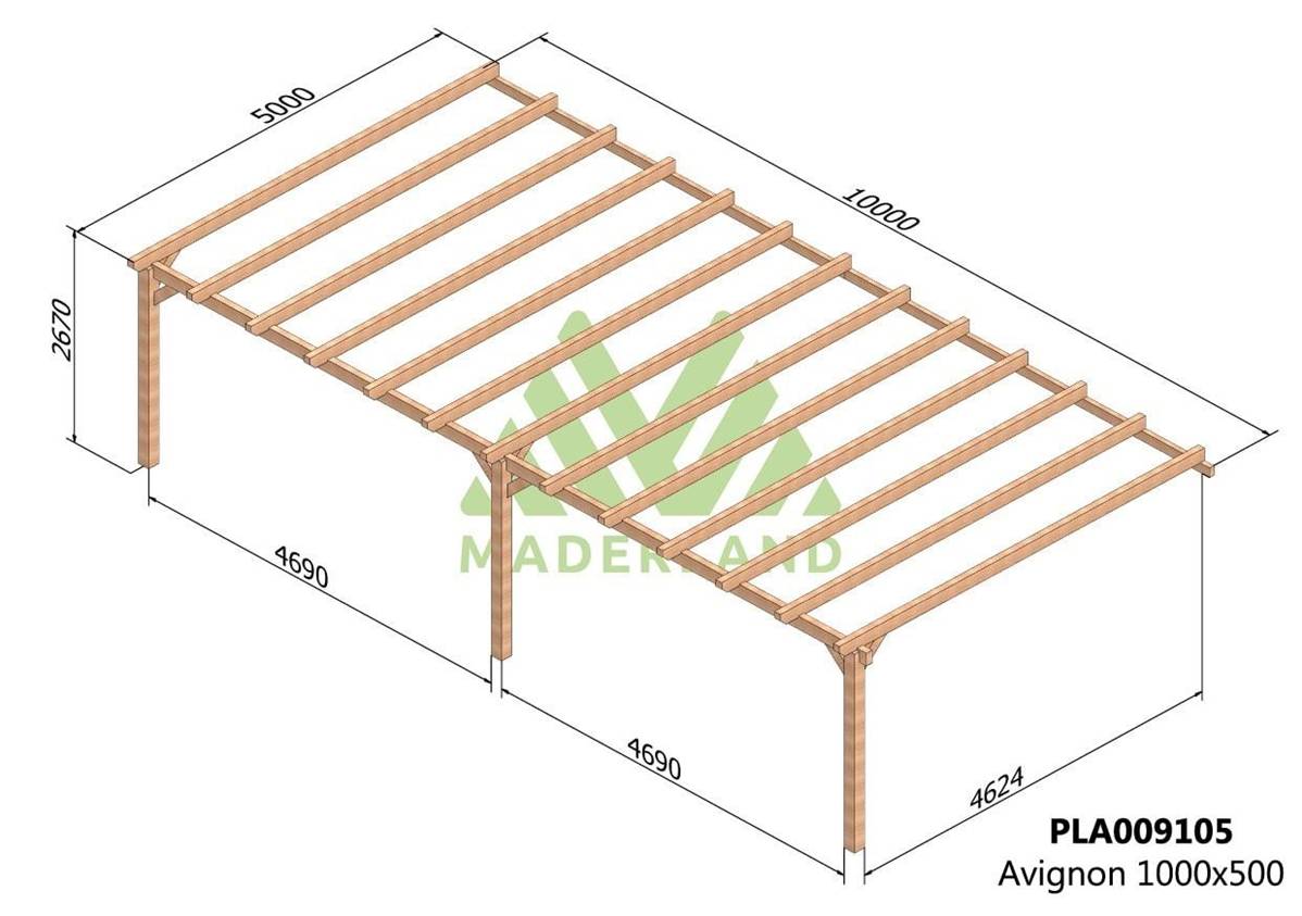 La quantité de poteaux, de poutres et de traverses peut varier en fonction des dimensions choisies, cette pergola a 3 poteaux, 2 poutres porteuses, 4 poutres de mur et 13 traverses.
