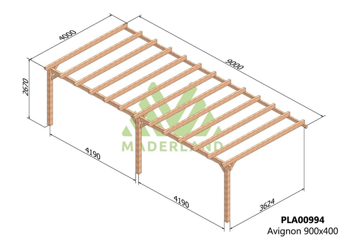 La quantité de poteaux, de poutres et de traverses peut varier en fonction des dimensions choisies, cette pergola a 3 poteaux, 2 poutres porteuses, 2 poutres de mur et 13 traverses.