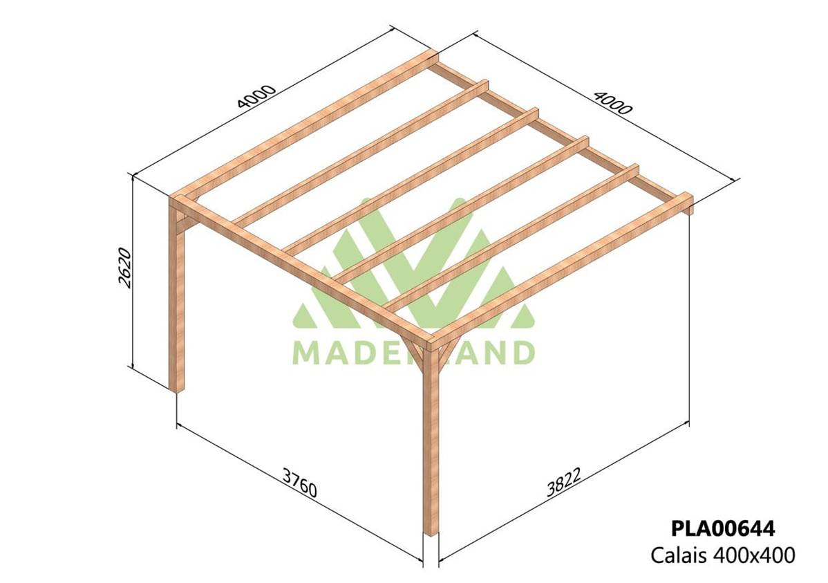 La quantité de poteaux, de poutres et de traverses peut varier en fonction des dimensions choisies, cette pergola a 2 poteaux, 1 poutre porteuse, 1 poutre de mur et (4+2) 6 traverses.