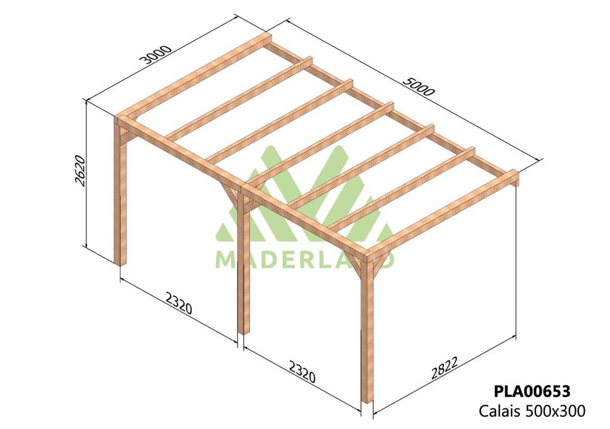 La quantité de poteaux, de poutres et de traverses peut varier en fonction des dimensions choisies, cette pergola a 3 poteaux, 2 poutres porteuses, 2 poutres de mur et (5+2) 7 traverses.