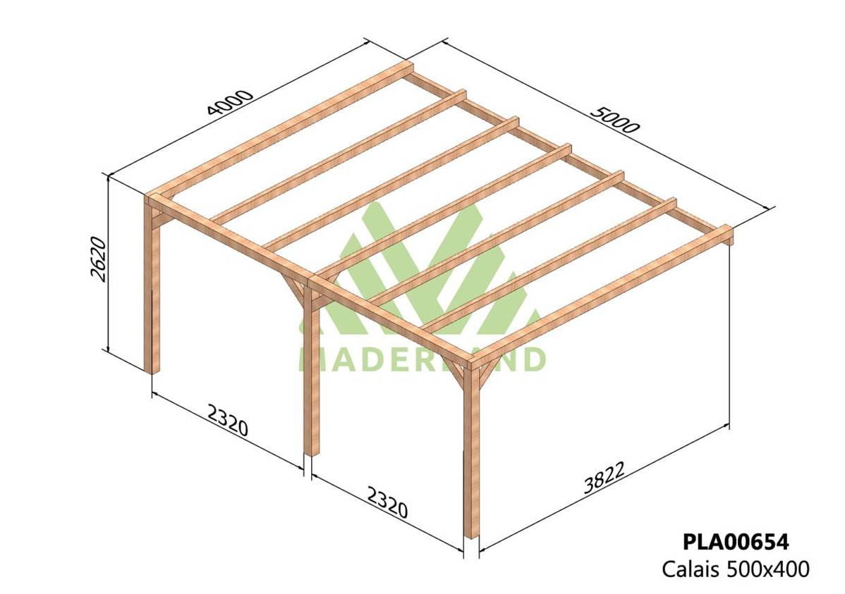 La quantité de poteaux, de poutres et de traverses peut varier en fonction des dimensions choisies, cette pergola a 3 poteaux, 2 poutres porteuses, 2 poutres de mur et (5+2) 7 traverses.