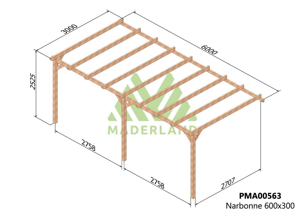 La quantité de poteaux, de poutres et de traverses peut varier en fonction des dimensions choisies, cette pergola a 3 poteaux, 2 poutres porteuses, 2 poutres de mur et 9 traverses.