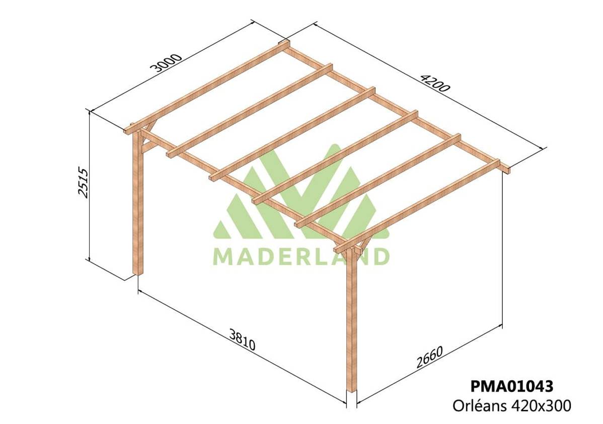 La pergola bois adossée ORLÉNAS est fabriquée par Maderland en bois massif traité provenant du nord de l’Europe, où la croissance lente garantit de meilleures propriétés mécaniques face à toute éventuelle adversité, améliorant la résistance à la flexion statique, à la compression et à la traction.