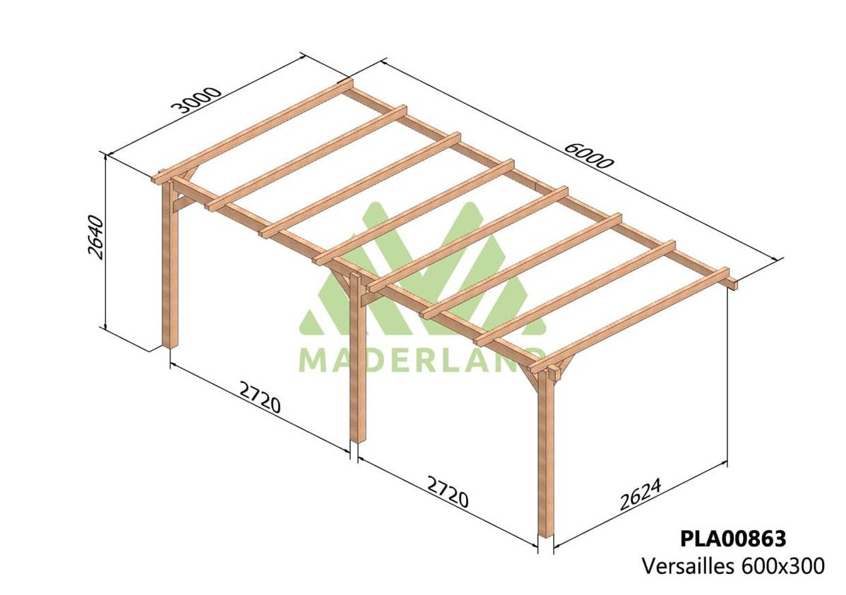 La quantité de poteaux, de poutres et de traverses peut varier en fonction des dimensions choisies, cette pergola a 3 poteaux, 2 poutres porteuses, 2 poutres de mur et 8 traverses.