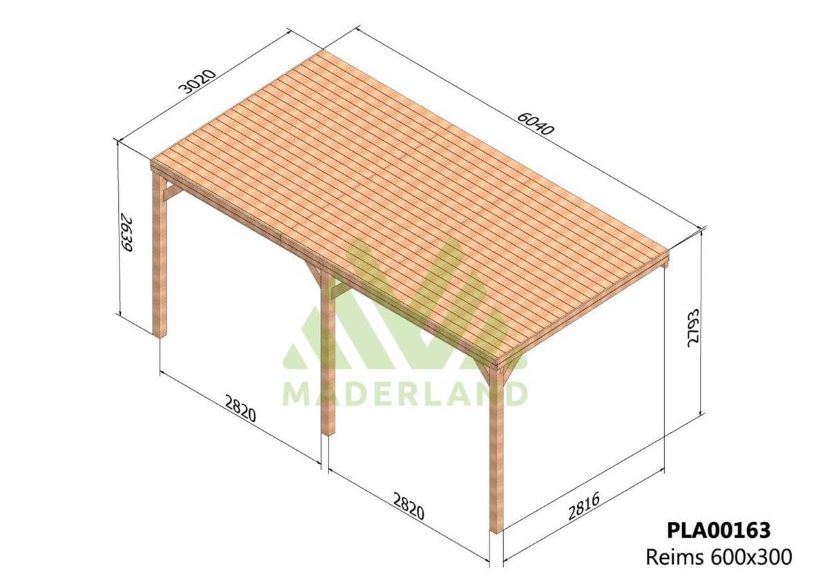 La quantité de poteaux, de poutres et de traverses peut varier en fonction des dimensions choisies, cette pergola a 3 poteaux, 2 poutres porteuse, 2 poutres de mur et 8 traverses.