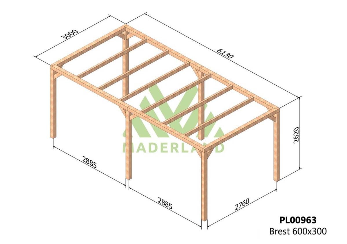 La quantité de poteaux, de poutres et de traverses peut varier en fonction des dimensions choisies, cette pergola a 6 poteaux, 4 poutres et (6+2) 8 traverses.