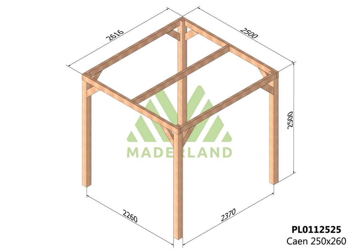 La quantité de poteaux, de poutres et de traverses peut varier en fonction des dimensions choisies, cette pergola a 4 poteaux, 2 poutres et 3 traverses.