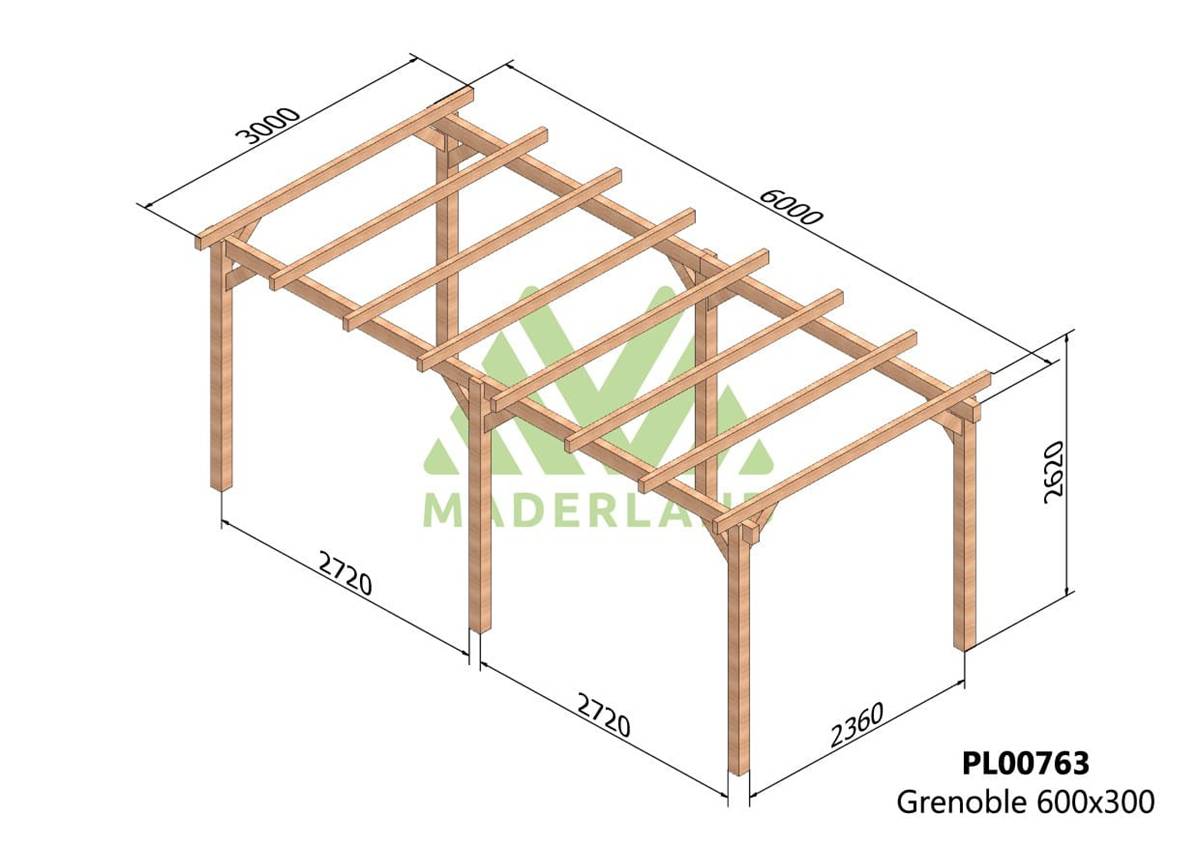La quantité de poteaux, de poutres et de traverses peut varier en fonction des dimensions choisies, cette pergola a 6 poteaux, 4 poutres et 8 traverses.