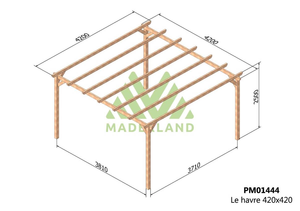 La quantité de poteaux, de poutres et de traverses peut varier en fonction des dimensions choisies, cette pergola a 4 poteaux, 2 poutres et 7 traverses.