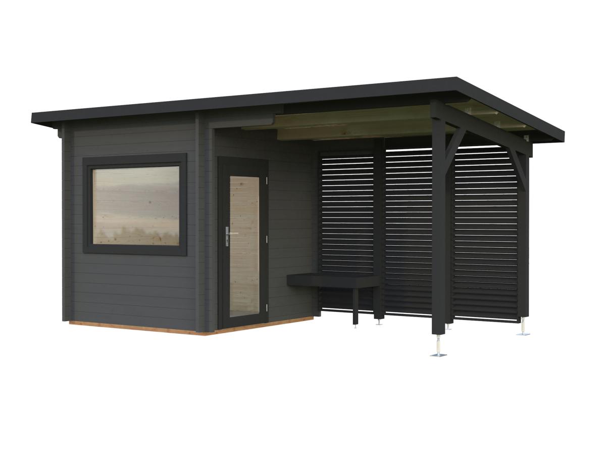 L’ensemble comprend un espace sauna fermé ainsi qu’un auvent extérieur de 5,9 m², parfait pour le repos, le rafraîchissement ou le rangement du bois. Les bancs intérieurs en tremble à deux niveaux offrent un confort optimal.