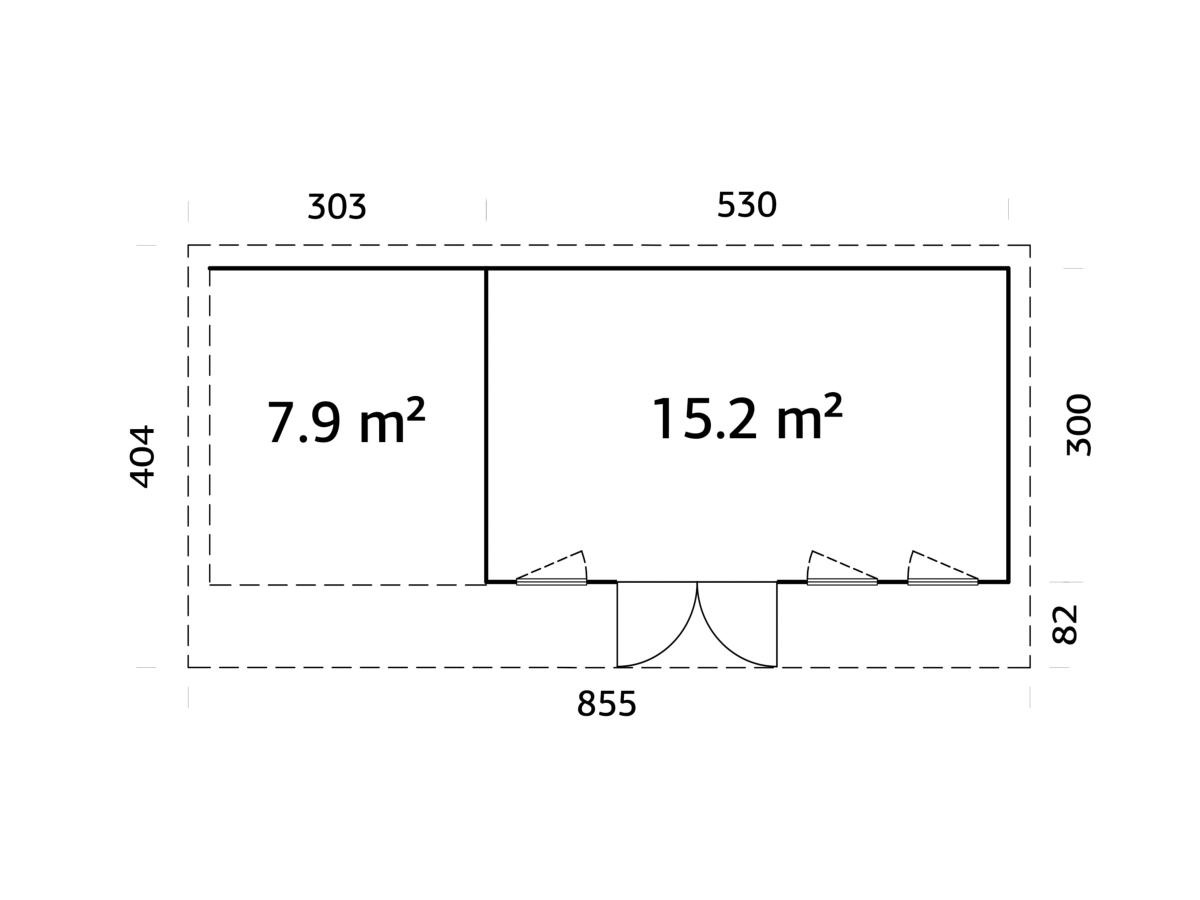 Studio de jardin Palmako Aurelia 15,2 + 7,9 m² en bois massif 44 mm, finition bois naturel non traité. Menuiseries aluminium double vitrage trempé, plancher inclus.