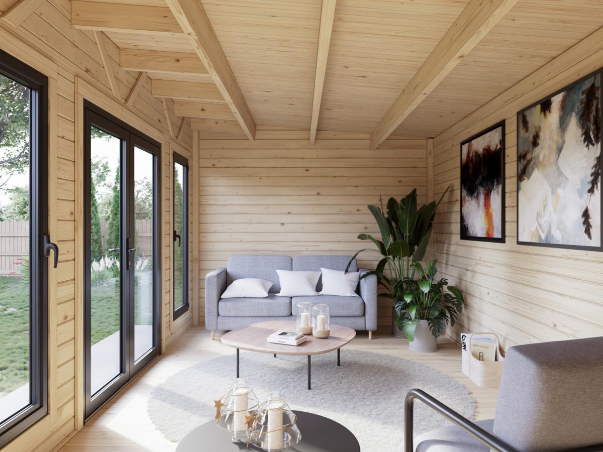 Studio de jardin Palmako Aurelia 15,2 m² traité par immersion marron. Bois massif 44 mm, double vitrage aluminium, plancher inclus.